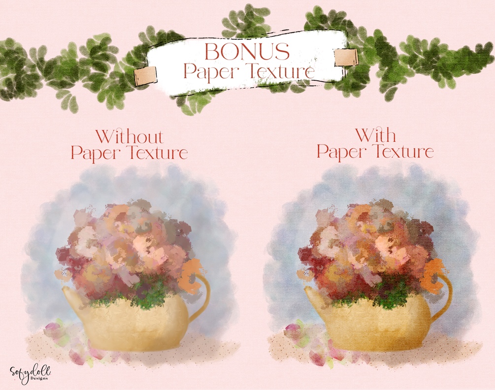 PLUS you get a free, bonus brushset of 10 brushes AND a canvas paper texture in both portrait & landscape formats...this is a great set all around. Everything you need to create your digital masterpiece!