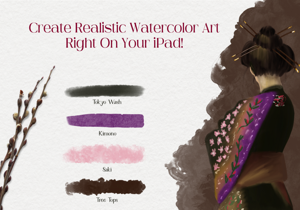 Create realistic watercolor artwork on your iPad with Tokyo in Watercolor brushset for Procreate. 28 delicate and detailed washes add depth to your digital art.