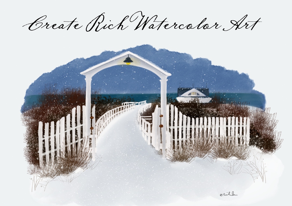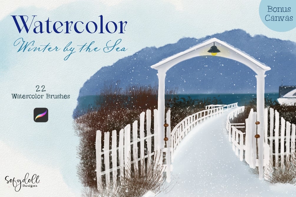 Living in a quaint New England town, one of the more beautiful times of year to visit the seaside is in Winter. Soft snowfall against rich ocean blues make for a dark, vibrant and lovely scene. I enjoy creating art that reflects that scenery with delicate, handcrafted watercolor brushes I created specifically for Procreate. Now you can create the same kind of beautiful scenery.