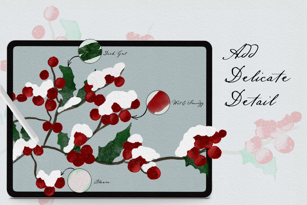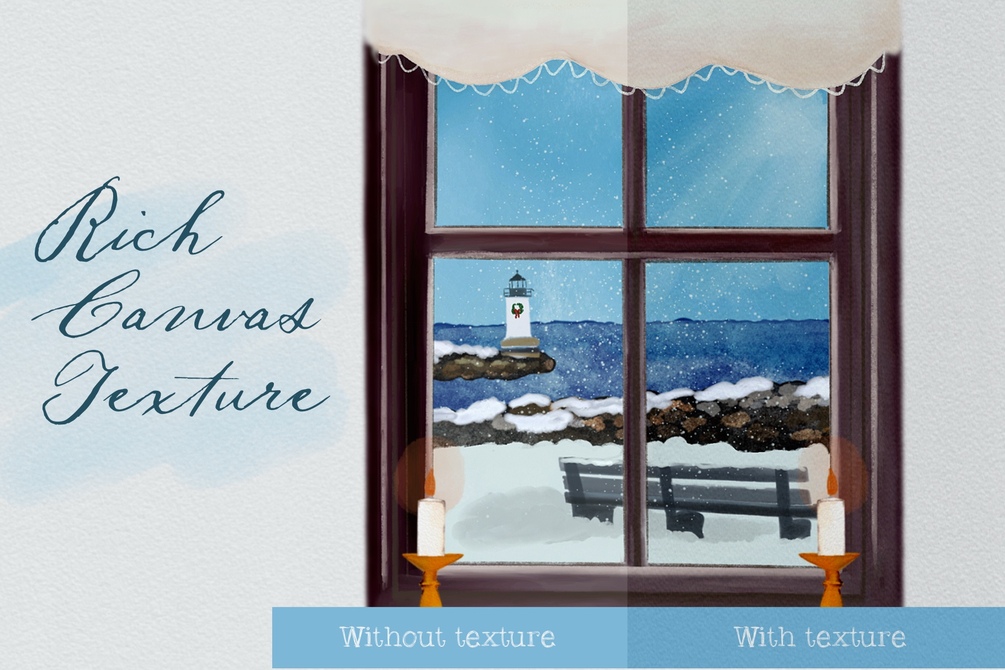 Living in a quaint New England town, one of the more beautiful times of year to visit the seaside is in Winter. Soft snowfall against rich ocean blues make for a dark, vibrant and lovely scene. I enjoy creating art that reflects that scenery with delicate, handcrafted watercolor brushes I created specifically for Procreate. Now you can create the same kind of beautiful scenery.